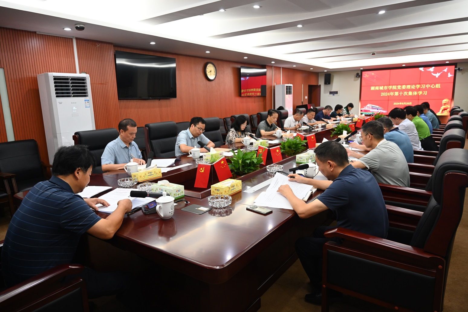 本网讯(通讯员 周文娟)8月29日,学校党委理论学习中心组在办公楼一会议室举行2024年第十次集体学习,深入学习党的二十届三中全会精神,并就如何抓好贯彻落实进行工作部署。党委书记汤放华主持会议,校党委理论学习中心组成员参加会议。
