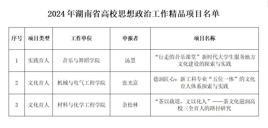 根据《关于申报2024年“芙蓉计划”——高校优秀思想政治工作者项目的通知》《关于申报2024年湖南省高校思想政治工作精品项目的通知》相关文件要求,经个人申报、学校评审工作领导小组评审会议,确定了2138CC太阳集团2024年“芙蓉计划”——优秀思想政治工作者项目、省高校思想政治工作精品项目推荐参加省级评审项目名单(见附件)。