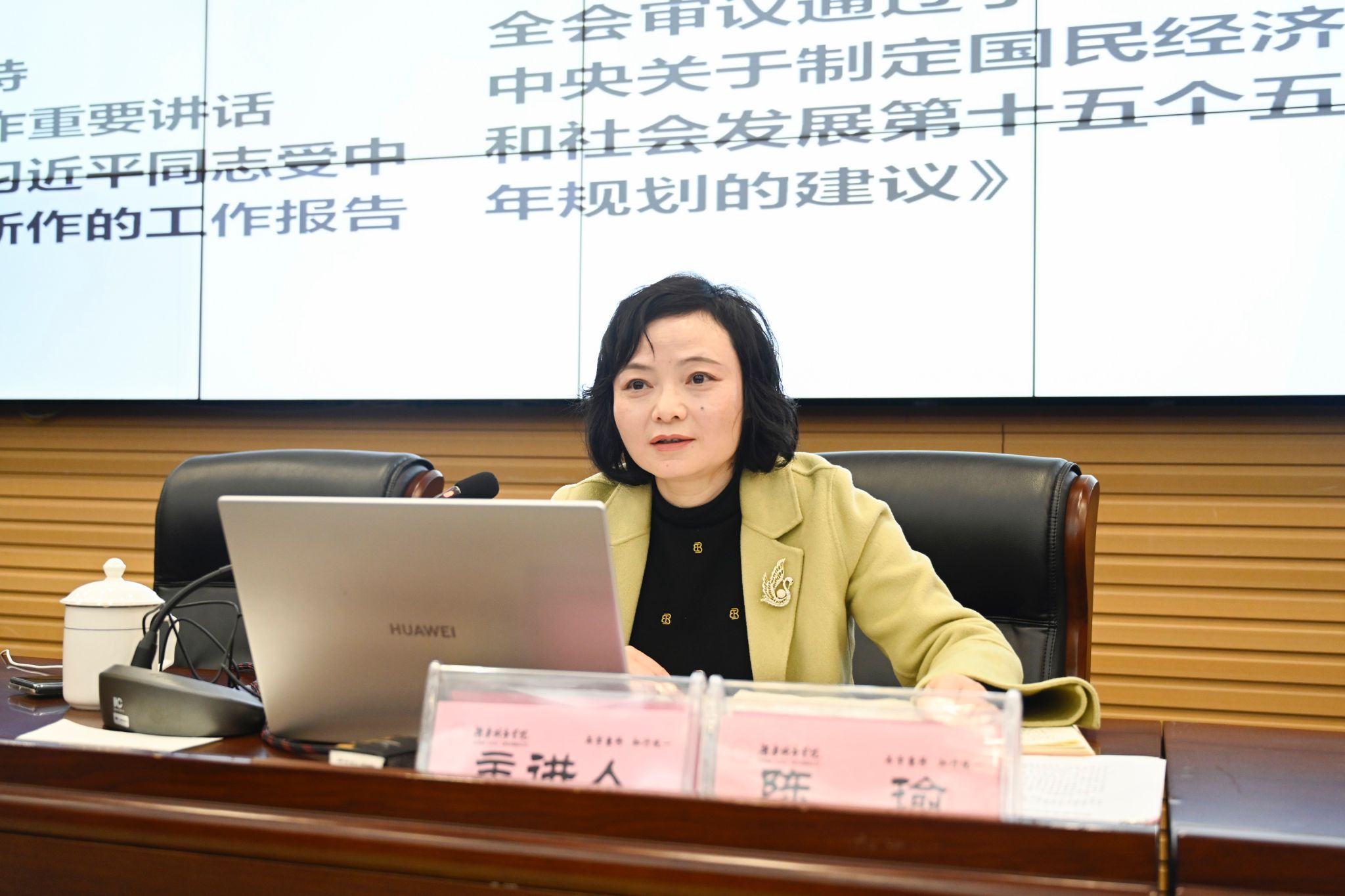校长陈瑜以“学习贯彻党的二十届四中全会精神——加快构建新发展格局,扎实推动高质量发展”为题作学习心得分享。陈瑜从“怎么学、怎么看、怎么干”三个角度,系统梳理了党的二十届四中全会的核心要义,深入解读了“十五五”规划的战略部署和发展原则,并结合高等教育发展新形势新要求,分析了学校面临的机遇与挑战。